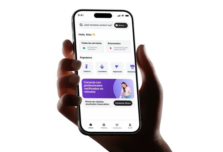 App que conecta personas con profesionales certificados: electricistas, plomeros, carpinteros y más. Diseñada y desarrollada desde cero.