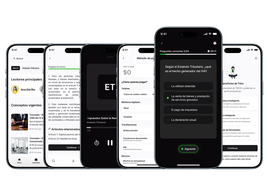 App mobile para contadores y abogados en Colombia. Lectura y escucha de artículos especializados, con olimpiadas de conocimiento integradas para validar el aprendizaje.